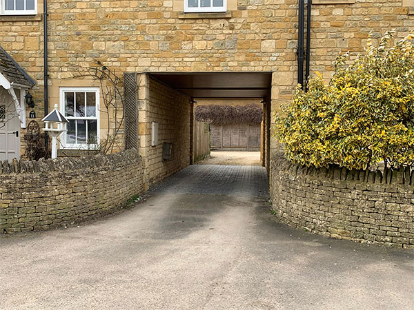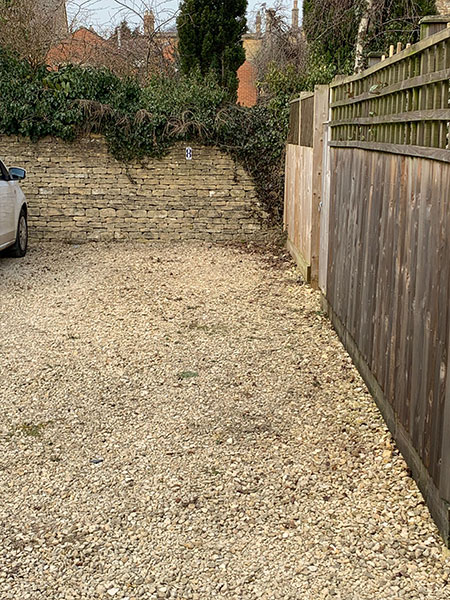 parking spaces and small enclosed walled gardens at the front and back of the cottage with outdoor seating.